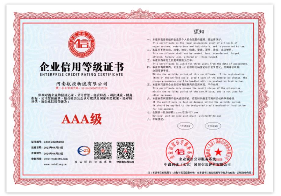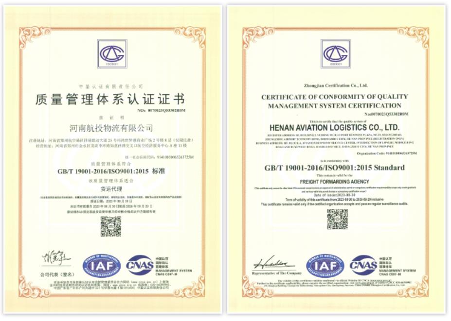近日,航投物流通過(guò)GB/T 19001-2016/ISO 9001:2015質(zhì)量管理體系認(rèn)證審核,榮獲ISO質(zhì)量管理體系認(rèn)證證書,同時(shí)獲得了企業(yè)信用的最高評(píng)定——AAA級(jí)企業(yè)信用等級(jí)證書,被授予“十證一牌”。喜獲雙重肯定,意味著航投物流在行業(yè)綜合競(jìng)爭(zhēng)中邁上新臺(tái)階,是對(duì)其高效業(yè)務(wù)流程、標(biāo)準(zhǔn)化經(jīng)營(yíng)、規(guī)范化管理模式的肯定。